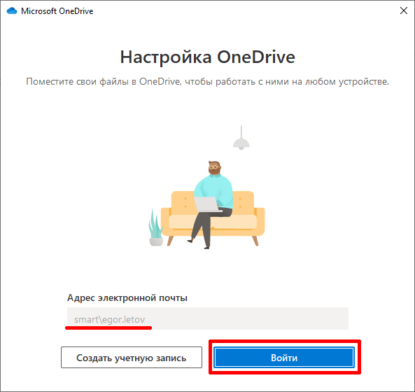 Подтверждаем открытие приложения OneDrive. В мастере настройки проверяем свои данные и нажимаем "Войти"