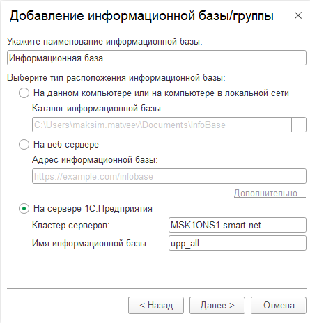 1. Если на вашем ПК в 1с по умолчанию входит в ваш профиль, а необходимо зайти под другой уз надо выбрать ту базу в которую хотите зайти и скопировать строчку ниже и нажать добавить