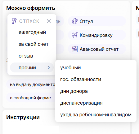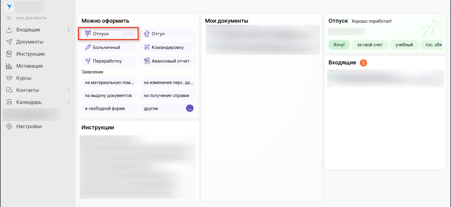 1. Чтобы пойти в отпуск - необходимо сформировать заявление и обозначить даты. Для этого нужно на главной странице воспользоваться кнопкой "Отпуск"