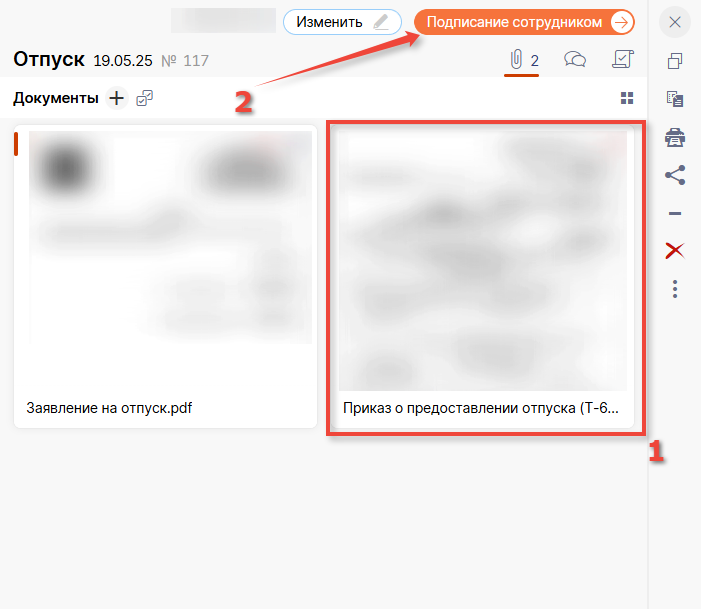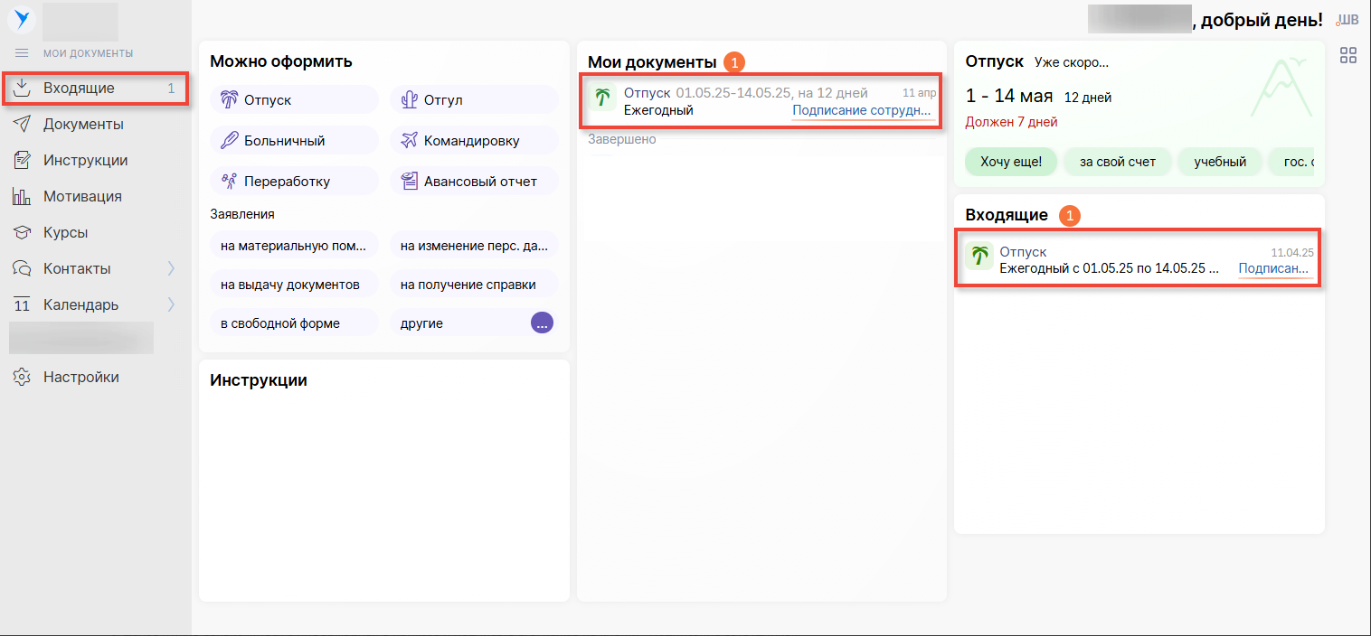 Необходимо в виджете на главной странице (или в разделе "Входящие") открыть задачу по подписанию отпуска.